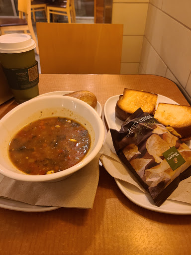 I walk in and the cashiers are very nice and welcoming but the "welcome to panera" gets very obnoxious. The food is good, but I feel like the portions were too small for what I pay for. I come to panera to relax and enjoy my overpriced food, I dont come to panera to hear the same ladys voice throughout the cafe, there is always one person who is extremely loud and kills the relaxed feeling that flows in this store. Ive noticed that this lady is here during breakfast hours, so I go through the drive thru in the mornings. The drive thru is normally quick, but at times can get backed up which is understandable. The cashiers at the window always seem to notice when a person has been waiting a while because they have always apologized for my wait. Overall this panera is a wonderful store, I just wish it wasnt as loud and hectic during breakfast hours.