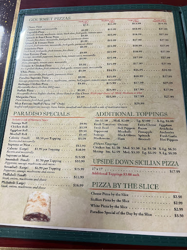 Used to be great until they got cheap. I have been eating pizza here for two years and havent had many problems until recently. Someone over there likes to cut corners by taking pizzas that were made for slices that have been sitting around putting fresh cheese and toppings on them and sending them out to customers who are expecting a fresh pizza. It has happened to me 3 times now and Im done with them. I know my pizza and I know what fresh pizza is supposed to look and taste like. I am very disappointed and angry that anyone would ever do this goodbye paradiso id rather eat from a chain then take a chance on u again.