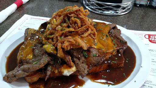 This interesting take on the 24-hour retro diner falls far short of its potential. I went with a friend to Red Mug after a SAK show between 10:30 and 11PM. They had a deal advertized at the show that with two ticket stubs, they would include a free signature milkshake to share with the purchase of entrees. The only problem that on this night they were all out of milkshakes. Our server graciously offered to comp an appetizer rather than the milkshake, but once again, they were out of almost half of their appetizers, including some of their signature ones. We eventually settled on the truffle mac-and-cheese (...it was either that or onion rings). The mac-and-cheese was very good - it was buttery, and didnt have that thick and heavy texture that mac-and-cheese often does. It was enough to serve two to three. My friend and I ordered the brie and apricot grilled cheese to share, which comes with waffle fries and a (red) mug of creamy tomato soup. A couple of other friends at our table ordered from their 24-hr breakfast menu: eggs, bacon, with biscuits and gravy. Our sandwich was excellent, with the sweet apricot jelly balancing out the slightly bitter taste of the brie. The soup was indeed creamy, and was a nice compliment to the sandwich. Unfortunately, our other friends did not share our luck. The gravy was sour, and the dish tasted terrible. They sent it back. The chef came out and apologized (apparently, the day chef had prepared it incorrectly earlier - a recurring theme with this guy, according to the wait staff). He offered the Sun and the Moon to our friends in order to apologize for the previous dish, and came back with a whole plate of chicken and waffles, mashed potato, an almost two foot diameter pancake, and about a half pound of bacon. The wait staff was decent. They were cordial and apologetic about the state of the meal. I felt for them, since I know that it isnt their fault if a significant portion of the menu is unavailable and things come out of the kitchen wrong, and they did their best with what they had. However, they were often inattentive. We had to ask two or three times for things like silverware and soda. I imagine that they are overworked, and the place was definitely understaffed, although it wasnt very busy at that time.
