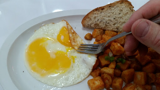 Just Wow….Red Mug Diner Kim and I went for breakfast this morning at Red Mug Diner, downtown on Pine Street in the old Ed Smith/AnsweRite building on Pine Street. I was concerned as I headed downtown that parking might be a problem, but at 7:30AM on Sunday morning there was parking everywhere. When we entered we were greeted promptly, and told to sit wherever we would like. The place is red and white and cheery. There was only one other table occupied in place. It’s interesting to be sitting in the space where I used to work at AnsweRite and where my brother met his wife, who was the receptionist there back in 1984. The menu is printed on the placemats. It is not a large menu, breakfast, lunch, dinner and dessert all on the same side. But better to do a reasonable number of things right, than a lot of things mediocre. The Coffee is from ‘get roasted…locally’, Kim spent the entire meal raving about how amazing the coffee is. It is served in a metal carafe, so you don’t have to wait for refills. Not that I had to wait for refills on my Coco-cola, because the server brought me another before I finished the first. Kim ordered the ‘Gargantuan Buttermilk Pancake’ and I ordered the ‘Old School Biscuits & Gravy’. The ‘Old School Biscuits & Gravy’ was $8.95, which was truly a deal. My meal came with two eggs, four slices of bacon, grilled tomato slices as well. The biscuits had a proper snap on the bottom but were soft and pillowy, the gravy was not the usual roux laden variety most places serve, it had more of the consistency of a Suprême sauce, and was loaded with fine ground pork and seasoning. The thick sliced grilled tomatoes were done perfectly, they were seasoned with salt, pepper and herbs, and were the perfect accompaniment to my light and fluffy scrambled eggs. The classic smoked bacon (versus the thick cut fruit wood smoked variety) was cooked just right. The plate presentation could have been used for a photo shoot. My wife enjoyed her mosterous pancake, but was unable to finish it, which I think is to be expected. It was served with whipped butter. One of the things I liked about the place, it feels like a diner or tavern from back home in Pittsburgh where I grew up. The layout does not have high booths or partitions, it feels like it was laid out to allow a sense of community. There is an informal, friendly, caring and knowledgeable style of service which will serve the well. I look forward to coming to try some of the other breakfast items, and the lunch and dinner offerings. The sandwiches and entrees on the menu all seemed very reasonably priced. The desserts at $7.95 from The Dessert Lady, I will have to reserve judgement on till I have the chance to try them.