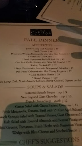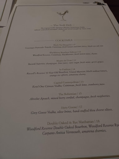 We were able to experience from a group perspective, how attentive the staff was,all the while, we were organizing a surprise birthday party! Overall the experience positive and absolutely delishious. Even the least expensive menu item had delicious portion size. Be prepared for classy experience at The Capitol Grille!