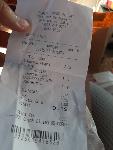 Dont get me wrong, tropical smoothie food and drinks were delicious. Our dining experience in the cafe was disgusting. Reason being, there were no less than 30 flies both lying dead on the floor and flying around the cafe. I can only imagine that the reason is that the kitchen is less than clean and flies are laying maggots. A worker swept them up while we were eating and she was trying to kill them by smashing them with the broom. This is obviously a correctable and possibly temporary issue, but until then, two stars.