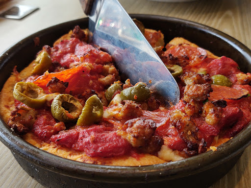 We ordered appetizers for the entire table (5 of them) and a kids make your own pizza. Our order arrived after a long period of time (in fact our son got his pizza right away and was almost done when it the rest of the order came). The pizzas we got were some type of potato appetizer pizza and they were both Luke warm so we asked the waitress if they could be heated more. She did but when it arrived back it was chewy and overlooked. We were very disappointed in the food quality and left after that. Later that night I began feeling sick to my stomach and starting throwing up a few hours after eating and continues for half the night. The other half it switched to diarrhea and a bad headache. Beware I believe I have food poisoning. The bad thing is my gut said not to eat it when it was Luke warm but I tried a piece anyway and another when it came back so 2 small pieces and I feel this bad. I cant imagine if I would have ate more!