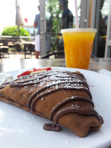 This place was discovered by chance as we were roaming around the Orlando Eye area. While the place has some very interesting food options in terms of sandwiches, crepes, croissants etc. We went for their herbal and detox teas and the vegetarian option among the savory crepes (sans dairy) along with a plain croissant. They serve the tea separately in a glass container filled with water which has a strainer inside. This comes with clover honey on the side. The tea was really good with great flavor and relaxing experience. However, the savory crepe wasnt good - too much salt in the crepe batter and I guess the removal of cheese just alleviated the saltiness. The croissant was nice - although not a good combination with tea by any means. The overall experience was okay. The outdoor seating is really nice with Orlando Eye in the backdrop. Service was quick actually and the staff is very friendly.