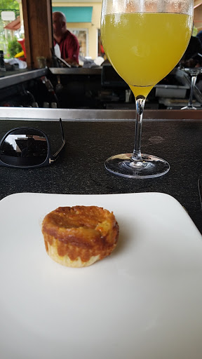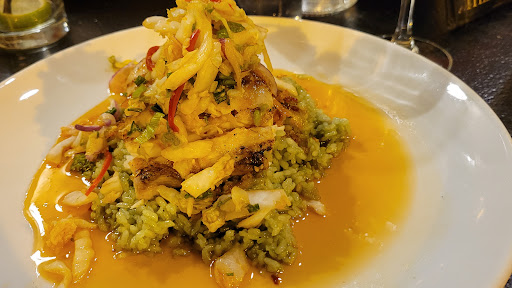 “Very Enjoyable” Located in the PGA Commons or I call it restaurant row. Definitely caters to the upscale country clubbers. Lots of outside seating but the night we were there, it was very humid. Started with the CRISPY CORNMEAL FRIED GREEN TOMATOES ,Lump crab & grape tomato salad, fresh ricotta, local mizuna,heirloom tomato emulsion, and pea shoots . It was different and very good. Also had the TUSCAN SALAD, field greens, cherry tomatoes, fresh mozzarella, Kalamata olives, roasted garlic, polenta croutons, and a balsamic vinaigrette. It was just fair. For entrees, my wife had the DOUBLE-CUT DUROC PORK CHOP , stewed black eyed peas, roasted patty pan squash, crispy okra, and a peach chutney. Very good. I tried a nightly special, The Cooper Clambake, shrimp, clams, mussels, langoustine andouille sausage, corn and red potatoes in a clear broth. Nice portion and variety but needed much more seasoning since it was bland. For dessert, we tried their signature dessert, The Cooper Sundae ,vanilla ice cream, bruleed bananas, hot chocolate fudge, salted caramel, spiced pecans, whipped cream, and cherries. Different and very good, meant to be shared.