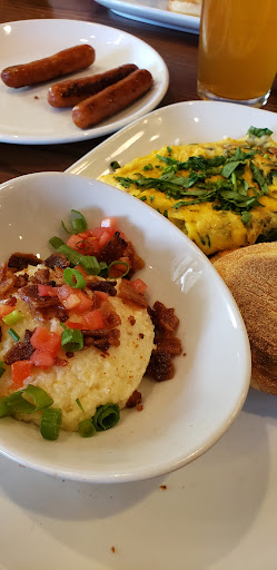 So too bad we started on the wrong foot here because other wise i would of given a full 5 stars. We came here for the 1st time this past sunday and arrived at 10:45am, we get in and they told us a 2 hour wait?? I was like theres no way its gonna take that long, theres not 2 hours worth of people waiting here, since theres was only a few people waiting outside, so we put our name down and we got a text to show where we were in line. we see there was like 80 parties ahead of us??? So unfortunately we had to wait and was seated literally 2 hours and 15 min later, then to be seated outside and wait more, then it started raining and then had to be moved inside...such a bad experience to start off, we should of just left but since it came recommended from a friend and wornt in any hurry ,we waited..but i think they should have a big sign up front/outside saying its a reservation only place on weekends and that we need to make line on the NO WAIT app before even coming inside, if we would of seen a sign we just would of gone on the app leave and go do other things. But noone said anything ahead of time, they should say off the bat, "hey just download the app and it will notify you when table ready" but instead scare people off by just saying :"oh theres a 2 hour wait" and dont mention anything about no wait app..alot of people just left after hearing that...so definitely a thing hostess should say .. Other than that..overall food was delicious, a bit overpriced for breakfast but due to their "unique omlette" creations i guess its not horrible. But we ended up spending $85 with tip for 2 people on breakfast food..since the pitcher of mimosas was $22 so that added it up! Other places for that price give you all you can drink mimosas..but whatever ,it is what it is.. but definitely for who ever comes here make sure to download the NO WAIT app and put yourself in line for the weekends, none the less it is a good place, pretty small for the volume of people but it did live up to the expectations as far as taste and portions. Highly recommend "hey lucy" omlette and french toast with fosters sauce...OmG super yummy ! Hopefully next time we have a much smoother experience since weve learned the hard way..