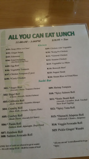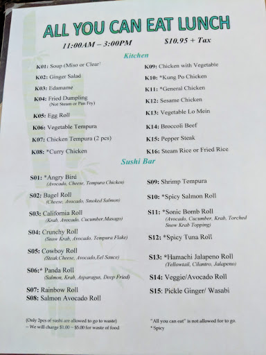 If your looking for an AYCE sushi restaurant (lunch) this is an option. Not the best Japanese cuisine I have ever had, but it will fill an empty stomach. I believe the AYCE is $11.99. Sushi is included on the menu along with other typical items such as edamame, General Tsos chicken, miso soup, etc..