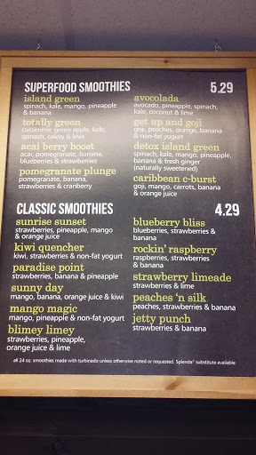 Amazing smoothies, even the ones that are healthy looking and you would think are gross. Some food is hit or miss. The Baja chicken flat bread is great.