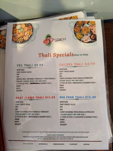 Great food. Weve been to a lot of Indian restaunts in broward county, yet this one is the one, our favorite of all. We had their buffet lunch and a la carte dinner. Our six years old son is fun of chicken Korma and naan. We love their masala dosa, always delicious. 5th element offers a lot of traditional dishes, as well great vegetarian options. Highly recommended.