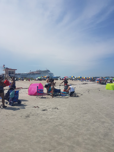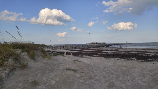 This Beach does have an entry fee ($15/car non-Brevard county residents) but that does give access to the park till 11 pm. Credit cards are accepted at the manned toll booth where maps of park and the Cocoa Beach area are available. The changing rooms and restrooms were located next to the parking lot. The changing room however was locked. A short walk from the restrooms and past the rinsing showers leads one to the beach. The beach had two lifeguards in the lifeguard station. Beach chairs, umbrellas etc were available for rent ( $10/day beach umbrella). The beach has fine white sand a gentle grade which meant my four year old could wade out 20 yards with ease. It was waist deep for me 50 yards out. The water was a cool 74F which was refreshing but cold. The beach was clean (no seaweed) and seemed to be local hangout. Although we did not visit the concession stand beer, food.etc was advertised. The adjoining park had multiple picnic benches with a stand-up iron grill for barbequing. A childrens park adjacent to the picnic area had multiple slides and swings but very little shade. Cruise ships leaving the harbor were a regular sight from the beach and jetty. Great beach the best on the Cocoa Beach strip especially if you have young kids.