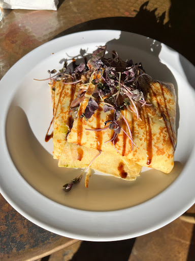 Mmm, big portions! Good, quiet atmosphere here. Pick up your silver ware on the cabinet before you eat. I had the Breakfast crepe and cinnamon roll. Looks like an outdoor dining area also