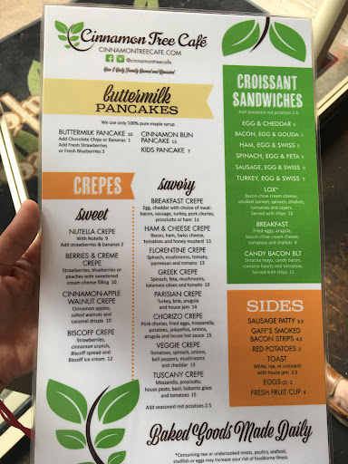 +1: Coffee is cheap; +1: Coffee is strong; -1: The music is awful, and the atmosphere is consequentially senile; -1: it is so cold all of the time to the point that I cannot stand it. 0: they basically only serve crepes, which I think a very strange limitation when a traditional griddle would allow you to craft every breakfast item under the sun, but if crepes are your thing then I suppose you have come, at least, to not the wrong place. However, crepes are not my thing. Lets give a -1 for being expensive when there is the clear opportunity to not be expensive. I want to give an additional -1 for the fact that they have their employees dressed in cutsie butler bowties like every single customer is Bruce Wayne. I keep coming back here because I am not able to sit and work on my laptop for two hours at the Circle K; but if I could, I would, and I wouldnt come back to Cinnamon Tree. -1 for the non-presence of any actual cinnamon flora.