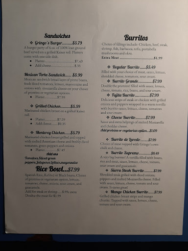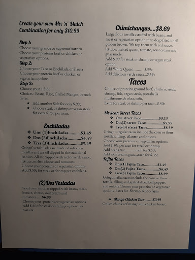 I ate here once, decided to treat myself for my Birthday. Gringos is the perfect name ! Nothing Mexican about it. I cant understand how people rave about this place, obviously they have never been to a real Mexican restaurant! The servings and service, were fine, but the food was very dissappointing, it had no taste whatsoever. The salsa was like eating chopped tomatoes with some green onion on top, had absolutely no flavor. I had a combination plate and the only good thing on it, were the refried beans. Sorry but this ex California thinks people around here have absolutely no idea what real Mexican food tastes like. I might add I have worked as a cook for a good portion of my life. This was simply not up to snuff!