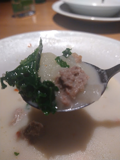 I havent gone to olive garden in years just because I knew the quality of food has gone down hill for sometime now and nothing changed tonight. Its even worse now I understand alot of apps are frozen like tonight and you gotta watch cost and control but nothing can describe this calamari tonight we had to send it back. Ive gone to culinary school so expectations are little higher but no excuse. My gf played it safe and ordered soup salad bread sticks, all the soup was watered down. The salad was probably a good 2 days old soggy, carrots were pale because of being old, tomato indescribable why even waste money on tomato if they arent edible. lettuce was like eating toilet paper that sat in water. I got the buy one get one to take home. The chef was coming out to people tables left and right for complaints he looked flustered to say the least. Someone should be checking every bowl of salad and dish before coming out the kitchen come on expo. Olive garden just shut down!
