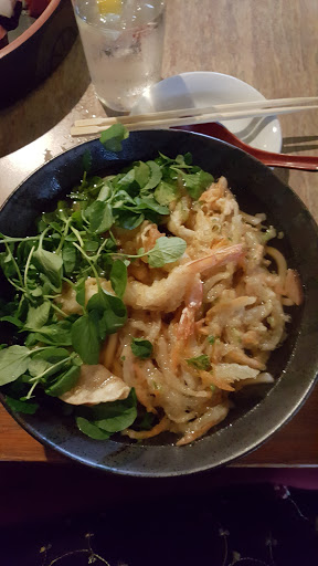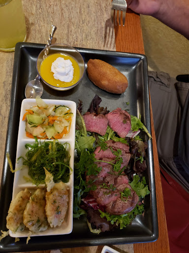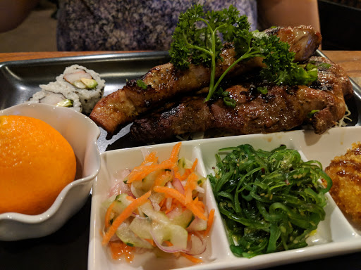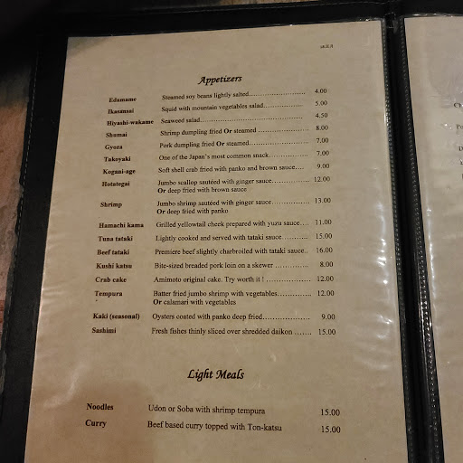 The restaurant provides a menu of sushi and primarily red meat or fish entrees. It offers no soba or udon entrees which was very disappointing. We had the miso soup (good), shrimp/vegetable tempura (oily), seaweed salad (good), daikon/shitake side (overcooked), vegetarian sushi (very good). The serving staff is very attentive and congenial. The cozy venue is quiet & calm. The large painted lobster and crab in the sushi chefs area are made of bamboo and are spectacular, the other art is also lovely The Christmas village that was on display for the holidays was painstakingly installed and provided great magic to the restaurant. However, due to the fish & meat-focused menu, and lack of vegetarian options, sadly, we will not be dining here again.