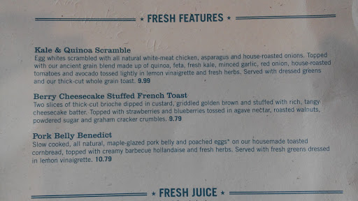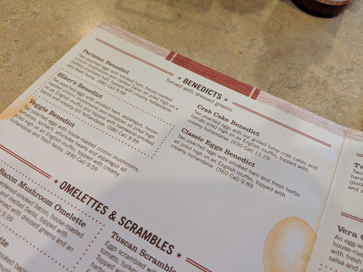 Great food, great flavors. Theyve got the usual heavy fare such as sausage and ham omelettes, bacon and pancakes and French toast, etc., as well lighter fare like vegetable wraps and fruit sides. But, I do have to knock off a star because of a missing critical component of an excellent breakfast - good coffee. I cant make any excuses for it. It really is just watered down and flavorless. Im not even a coffee snob! I just expect the coffee to be on the same level as the rest of the food. If they served better coffee, Id give them full marks.