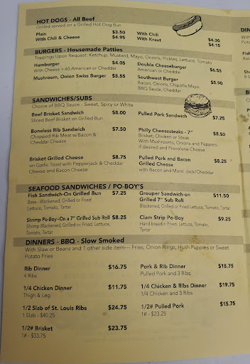 Great brisket, chicken and pork, but just good ribs. Loved their fruity cole slaw. My girl had clam chowder and grouper sandwich and she was happy too. My friends copmlained about his shrimp dinner portions, but my 4meat plate was huge! Im 220lbs, 64" and I had two meals out of that plate. Oh, and Im a fan of the simple outdoor setting of the place!