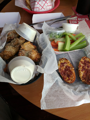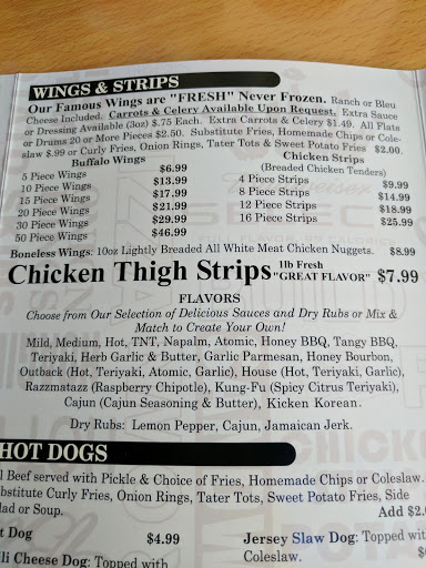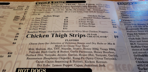The wings themselves were good - crispy. The sauce was bland & vinegary. "TNT" was not spicy at all. Menus were old and greasy with grammatical errors and no descriptions. Service was quite bad. Had to wait to get our order taken, then waited over 30 minutes for some wings. When we asked about the delay (politely) we were told shortly "when its ready well bring it right out." In reality, our food was already done and had been mislabeled as "to go" and had been sitting by the register as the three servers gossiped and battled with the register, which was apparently not taking credit cards. Then they realized our food was sitting there - oops! No apologies. They just dumped it into a couple of baskets and hoped we didnt notice. Thats when they tried to deliver it to the table but asked us what we had ordered because suddenly they didnt remember. Wings were well cooked. Curly fries were limp and greasy. Ranch was tasteless. Carrots tasted old. We wont be going back. Its more of a hangout for locals, I think.