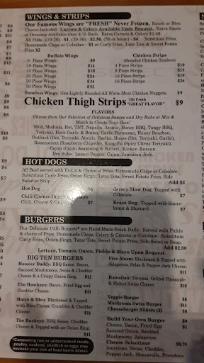 We have wings or burgers here regularly. Most the time the food is excellent,best wings in the area. Burgers are also delicious I like the buckeye my husband prefers the jalapeno burger.My daughter and son love the cheese cubes and the onion rings also excellent. Only complaint I can say is the service isnt always great depending on who is working.