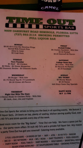 Timeout Sports bar is a great place to watch most any sports game. The staff is friendly, and the new menu has some delicious new recipes. Timeout has pool tables, shuffleboard, Darts, and plenty of video games to enjoy. Great place to have a great time.