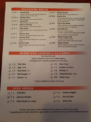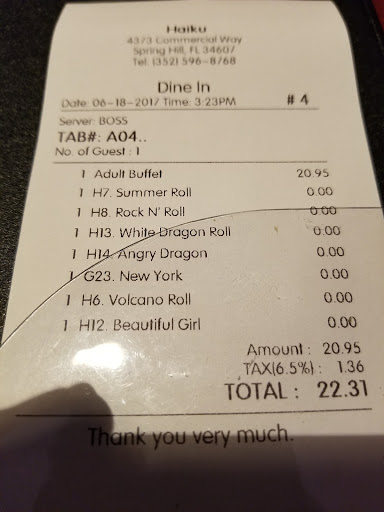 Im from Fort Lauderdale so Im normally accustomed to really great sushi. I picked Haiku through their reviews and Im very disappointed. Their staff was nice except for the fact that they didnt take off a meal of $23 that I wasnt happy with whatsoever. I couldnt even eat the sushi - the quality wasnt what I expected based off the reviews. I do not recommend this restaurant to anyone who is used to great quality and flavorful Japanese food. But I wish the owners good luck and hope they change their ways for the better.