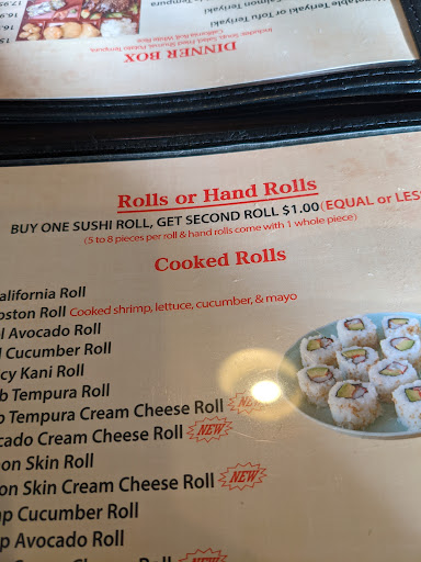 Ive been here twice now and the rolls are consistently great. Ive had the Volcano Roll, Monster Roll, Benjamin Roll, King Lobster Roll and the Spicy Tuna Roll. I think Ive had some more, but I dont remember all the names. It is worth it to get the specialty rolls, they have between 6-10 pieces and if they have 6 pieces they are really big. Im happy we have something like this in Spring Hill. It does take a while to get your rolls, so Id suggest ordering one or two rolls at a time or telling your server to bring the rolls as they get done. The first time it took forever then we switched to this method and everything was better.