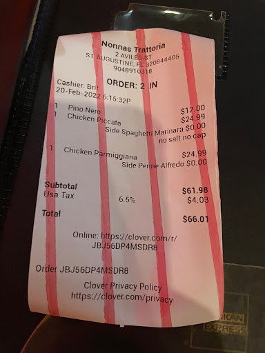 We were disappointed in our experience at Nonnas Trattoria. We arrived for an early dinner and were the only customers. We were not offered salad or bread and when we asked we were provided with a $10 salad to share and 4 slices of bread...at $1.00 per slice. The sangria and our pasta dishes were good. When we finished we sat with our dirty plates while the gentleman who served us sat at a table and talked with someone. It was very disappointing service.