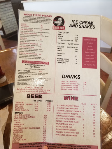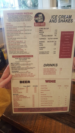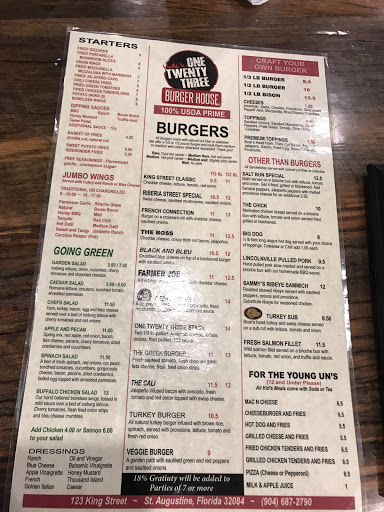 One Twenty Three Burger House is among the Pantheon of local St. Augustine restaurants for me that I will always take out-of-town guests to. Everything Ive tried there has been excellent, including burgers, brick-oven pizza, and even jumbo chicken wings. The atmosphere is energetic but not raucous, and the staff are friendly but not smothering. The only thing I cant recommend is the ice cream. The chocolate shake I ordered once tasted as though it was made with sugar-free ice cream. However, seeing as though this is a "Burger House" and not one of the dozen ice cream parlors in St. Augustine, I wouldnt dream of knocking a star off for it. The food is amazing and has yet to let me down.