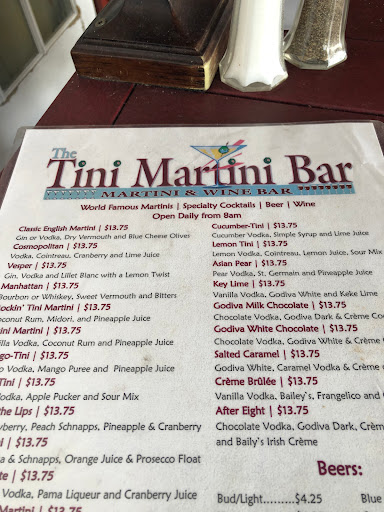 Very good drinks, and they are proud of them at $12.50/ea for the martinis lol. But we really did enjoy it. Calling it the Tini Martini Bar is accurate. Its small and cramped when its busy. But we didnt let that bother us having a great time. Just encourage us to chat with our neighboring tables. We did have fun, our server was very friendly and stopped by often. They have other drinks also, which are also quite good. There is a rear entrance that may not seem like the right door, but just walk right in and wind your way around to the front for the hostess. Or you can come in through the front which is right on A1A, with and out door front porch w/heaters and additional seating basically right on the sidewalk. They had very good live music on Saturday night up until we left at 11:30pm.