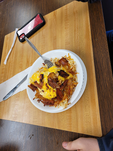 Very quick and friendly service. The rest of the family orders waffles, and I go for the bacon, egg and cheese on toast. And hash browns scattered, smothered, covered and chunked!