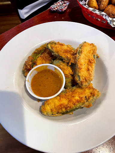 Above average food and caSual bar atmosphere. Fresh ingredients including fresh cut french fries, side salads. Excellent portabello burger and chix wrap. Good fast service. Happy hour beer specials. Our fav stop traveling off 95-S!