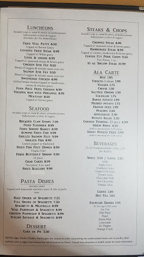 Wonderful place for diner type menu. Service is always fast and food is great and inexpensive! You cant go wrong eating here.