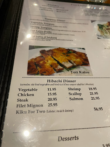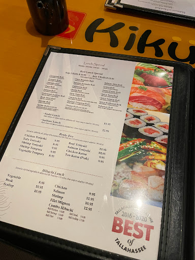 Kiku suffers at the hands of its owner and general manager, Michael Wang. My brother and I ate here today and there was a long hair in my hibachi chicken meal. I discreetly let the server know of this issue and she took the plate back. About 30 mintues later I received my new meal, seemingly "hair free". When I received my bill, I noticed that I was charged the full price for my hibachi chicken. I asked to speak to the manager and he told me, "Things like this happen here all the time." How disgusting for the manager to admit that they have poor hygiene practices. Also, he refused to comp my meal and instead offered me a $7.50 gift certificate, 25% of my overall purchase for this meal. He was very rude and argumentative over a self-admitted reoccuring problem. If you want quality Japanese food in Tallahassee please try Osaka or Jasmine Cafe. They treat their customers with the respect and dignity they deserve. Ive also never received a hairy dish from them.