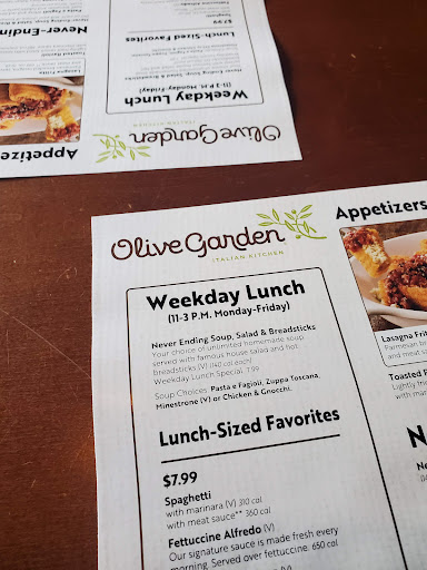Way better than I expected Olive Garden to be, based on recent years. I recommend you check it out if you havent already. I stand behind my 2014 review as an accurate reflection of OG then, but it isnt so today. For the past few visits, Ive picked up on a transformation here - both in front and back of the house as well as in ambiance. Our server today at lunch (Justin) was top notch. Good personality, attentive, respectful, confident yet humble. He was a very good representative of the restaurant and one who gave the diner the impression they were dining at a "next level up" establishment. Soup/Salad IS OGs bread/butter for lunch and four of us ordered this while one opted for a pasta entree. Everything came out swiftly and cheerfully. I had the opportunity to meet the GM before we sat down. I told him about my working here for a month (making breadsticks, then apps, then being "on the line" all in the prior of that month). Very nice guy who clearly has a vision for this restaurant and is leading OG towards the right direction! When I commented on the noticeably improved decor (e.g. The wine-rack wall upon entry) he told me they had gone through a substantial updating of decor and furnishings. Im happy to report that tallahassees OG is figuring out ways to stay relevant in an ever-improving marketplace. If youre seeking out a good lunch or dinner - this updated menu wont let you down - and youll feel like you went out to a nice restaurant to boot. One thing that Im NOT a fan of is the tablet terminal on the table. Yes - I get it that its convenient for some who are on a schedule (I used ours today) but I just dont like it. I get it that this paints me as a Luddite of sorts...