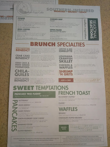 As a rule I shy away from chain breakfast joints. On three peoples recommendation I decided to give it a try. MISTAKE. I order chicken and waffles. Being in the south they have to have this down. Wrong. Overcooked thin breaded tough chicken. Waffle moderately tasty ice cold. Super hard whipped butter packets had zero chance of melting on the waffle iceberg. Overpriced no homey feeling I like for breakfast. Clearly kitchen does not cook withlove which is what breakfast should be. What your mom would make on a Sunday or any day of the week. Finally I sat not touching my food and asked for my check. With one bite each of waffle and chicken it was still a full plate. Waitress never asked how the food was. If she doesnt care to ask me then I write a review. DONT GO!