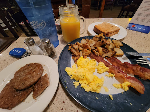 I know the service here is friendly but we went when it was slow and I mean very slow yet it seemed to take forever to get our food and drinks. Our waiter was polite and the milkshakes are awesome but the food was very basic. I mean I could of gone to Ihop and at least had a side of hashbrowns or something included for the same price. I dont know if it was just the fact that I got pancakes because its really hard to mess up a pancake anyway. My husband thought the poached eggs were okay but wasnt overly impressed. I wouldnt enthusiastically recommend but theyre certainly nice people and it you want to support a local business then this is as good as any place to get breakfast.