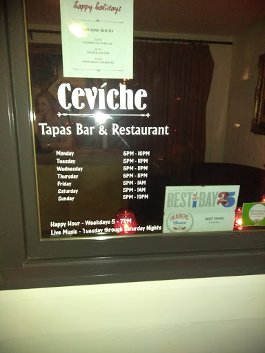 One goes to Ceviche for the ambiance, the music, and small plates of food and cocktails. The place is rather inviting, with burners outside, foliage to mask out the drone of cars and SOHO outside its premises, and intimate lighting. While some drinks may come a little watered down, ask for something straight or, mixed with no ice. The food is still delicious, but tastes must be certain before ordering. Its not the place to be adventurous. Go for what you know you like. Now, the most impressive feature, is Ceviches music. Flamengo guitarist and a Spanish band take their post on Friday night and fire away a steady, never-ending musical triumph unlike anything you may have ever seen. Most would agree this place is somewhere to go be entertained than satisfy cravings or hunger pains. Do try the Ceviche however, as it will bring you delight. Suggestions from the menu: Ceviche de Gambas (shrimp), Tablamixta, Chorizo y Pimientos, Albondigas, Paella de Puerco/Pollo (Chicken or Pork Paella)