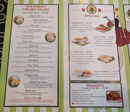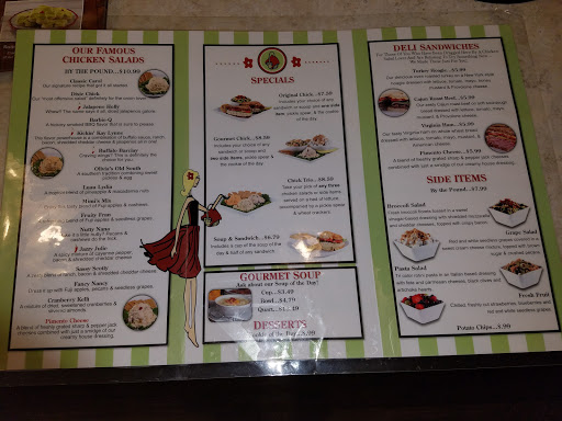 Delicious chicken salads in creative varieties, the location is cute and has a southern "home" feeling to it...staff is friendly and professional. Good place to go to when you want something different...