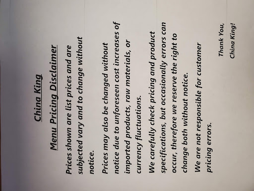 China King is an establishment that been there by the same owners since 1999. Everything made there from the meats down to the sauces they make themselves as to cutiing every piece of meats and vegs! Its as fresh as you can get! All the food thers is always consistent and fresh! "DO NOT EXPECT SAME QUALITY OF FOODS FROM OTHER RESTAURANTS!" IF YOU WOULD ASK US WHAT THE MEANING IS I WOULD BE GLADLY TO EXPLAIN WHAT IT MEANS! THIS MEAN WE ARE NOT FRANCHISED, WHATEVER TYPE OF FOOD YOU GOT SOMEPLACE ELSE DOES NOT PERTAIN TO THIS RESTAURANT BECAUSE THE OTHER RESTAURANTS ARE NOT AFFILIATED WITH CHINA KING.... DONT EXPECT WHAT YOU GOT FROM ANOTHER PLACE TO BE THE SAME AS THIS PLACE AKA.CHINA KING