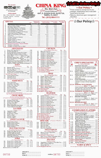 I give this Chinese food restaurant 5 stars because everytime I go there they have my order right they have the best Chinese food in Tampa by far Ive eaten at other restaurants and they were not able to compare to China King I love their food they have great customer service and Im one of their favorite customers