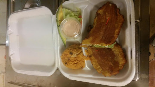 I was afraid at first, its not everyday you sit at a table and you get a menu with the prices blocked and scratched off. The waitress was pleasant (dont know her name, never told me) and told me that she would tell me the prices of everything, but still felt uneasy about that. My wife and I originally wanted a Mofongo con Carne Frita, but after asking the amount of pieces of tge carne frita, lets just the frugality of it, well...we opted not to. "BUT" we did get a Jibarito de Cerdo and both price and taste was very satisfactory! The only suggestion, offer a side of Mayo-Ketchu, a delicious spread that always goes well with plátanos. Check my wifes pic, nice presentation of our meal.