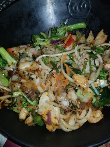 By 8:30 pm almost no wait time. Build your own. Nice selection of chicken, pork, ham, beef, mongolian beef, shrimp, scallops, calamari, whitefish. Then the veggie bars, the spice bar. If you want whole foods, they have them. Even 2 no soy sauces: garlic water, ginger water. I got ginger water for sauce and it was mildly hot. I enjoyed it thoroughly. I had double cabbage instead of starch. (Skip the corn and water chestnuts and go starchless.) With several tv screens you can watch sports or news or sitcoms. We always enjoy it.