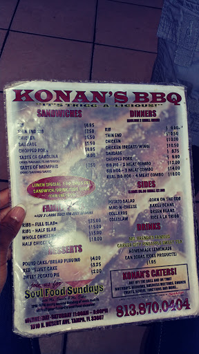 BEST BBQ IN THE BAY? Yes- Ive been to all the big BBQ restaurants in Tampa Bay (Rivers, Hog, Mission- these are just nicknames of course) as well as a few smaller ones, and I think this is my favorite. Who wouldve thought such an awesome (yet easily passable) restaurant existed within the shadows of all these high-end businesses in this area? And it still feels undiscovered! LET ME TELL YOU ABOUT THE FOOD Our three-meat platter included beautifully smoked and roasted Sausages, Chicken, and Brisket. The Chicken and Brisket were so soft and flavorful on their own- no extra sauces were needed. The Sausage casing had a great bite to it revealing another soft and delicious filling. The Mac & Cheese and Collard Greens were more regular but still worked greatly with the meat. The sauce is mustard-based which Im normally not a fan of... but it added a great tangy dimension to the meat (although unnecessary). HAS A COMMUNITY FEEL TO IT Youve probably passed Konans neighborhood many times on your way to I-Plaza. Do yourself a favor and embrace this area even if it doesnt look to be the cleanest. The young adults behind the counter were chopping the Meat to Beyonces music which was blasting into the simple dining area. While we dined, many people walked in from the neighborhood and took their items to go. I definitely plan to return.