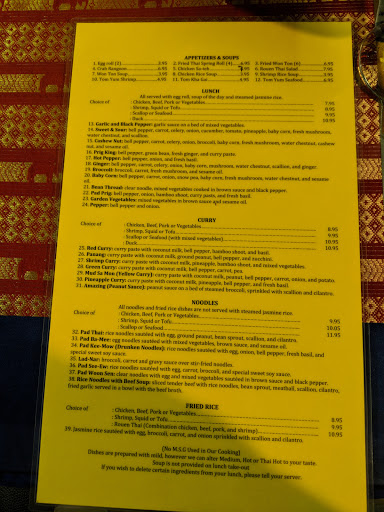The best Thai food in the area. I highly recommend their pineapple curry with chicken. I always start off a Tom Kha soup it is also delicious! I will say the last time I went the Tom Kha didnt taste as fresh neither did the pineapple curry. Please dont get lazy! Your food is so good when you guys are on it!