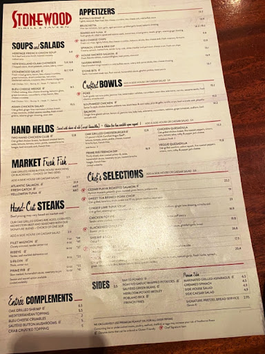 We were celebrating success in our business and chose this restaurant to splurge a bit. Our waiter was phenomenal and really talked up their new menu and how they revamped their steak selection. He touted the exceptional quality of the steaks and how they were top tier. My partner made the decision on the steak based on his recommendation. He asked for his steak to be prepared medium well and I ordered the trout. My meal was stellar! However his steak arrived basically still breathing. As he cut into it and blood squirt onto his asparagus we both gasped. The waiter agreed that the steak was unacceptable and returned it to the kitchen to "pop it back on the grill," yet when it returneda second time, the manager brought it out with a huge satisfactory smile and dropped it on the table. It was still crawling across the plate swamped in blood. We then decided that we needed to order something else. Meanwhile as I lopped up the delicious trout I had been sharing it, reluctantly with him (eating alone, I might add). He ordered the chicken and this meal was fine, but my partner couldnt help feeling a bit cheated out of his steak. To add insult to injury he ordered a mojito which was more mo than jito. It tasted of cherry sprite and his glass was filled with more ice than liquid. He ordered a second mojito with no ice to see just how much liquid was in the glass and sure enough the glass came back HALF FULL! Wow!! They didnt even put it in a smaller glass to try and compensate. This mojito was worse than the first. It was mostly sprite and juice and very little spirits. I ordered wine and I must say, I was feeling pretty good, but by now my partner was completely sober and ready to go. We got the bill and yes we were expected to pay for EVERYTHING! Now with my experience in the restaurant industry, I know that if someone has a bad experience and it is clearly the fault of the kitchen, the manger is obliged to offer something as a consolation. Generally they start with free desert. But we were offered nothing but a sheepish apology from the waitstaff, who was not at fault in the least. Not even the chef came out to explain his blunder. Stonewood is not Sideberns but their prices rival them for sure. We were appalled. We pointed this out to the waiter who again apologized and said he would speak to the manager. He came back and offered us one drink each on the house. We begrudgingly conceded, but again were flustered as to why the manager didnt come out to offer this himself. Needless to say, I needed to vent my frustration somehow which is why I am posting this, so if you visit this restaurant you can get a glimpse of what we experienced. I see nothing but glowing reviews of this restaurant, but with first hand knowledge, I can say that they are not always on point!! We wont be back. We work too hard and want to always have a good experience when we decide to dine out and with the new restaurants cropping up everywhere, we will make other choices when spending our money.