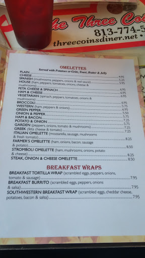 Three Coins Diner is an very good place to get breakfast! We stopped for a quick breakfast at TCD on our way home and it turned out to be a very good choice. I had a western omelet and my wife had a vegetarian omelet with cheese. Both were good, but my wife was especially happy with hers ... shes found that most places dont do those very well. They came with home fries - which were better than most Ive had - and toast. Service was friendly and quick, at least at first. By the time we were ready to leave, however, it took much longer than I expected to pay and get our receipt. Possibly a fluke, who knows? But the food was fine, and if you want a decent breakfast, Three Coins Diner will do very well.
