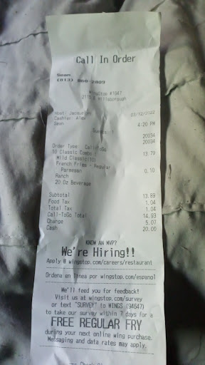 JUST DONT WITH THIS PLACE. Ghetto employees with ghetto attitudes. Ive eaten at other Wingstops in Tampa and this one doesnt live up to their good name. WINGS were under sauced, employees NOT FRIENDLY, I saw more employees lounging around and joking than actually working. I the 2nd time I stopped in I called another location to get prices and the other WS location quoted me a lower price than this current location! I guess the owner figures people wont be smart enough to shop around before buying food from their restaurant! This is OUTRIGHT SAD!
