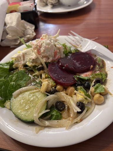 Waitresses are nice food is good but I had myself and my 2 year old with me no high chair was offered nor someone to help worth my tray.. after I put our tray down at a table I went back to the front asking for a high chair she said they were by the banquet hall of it want for me going to the restroom on the side I was sitting at I wouldnt have known where the banquet hall was..... I had to walk to the other side of the restaurant to get high chair and back to our table... be more considerate to mothers who have small children and are there alone....