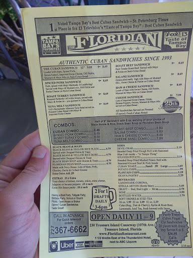 Place has been around for many years Locations in Treasure Island and Tampa Some of the best Cuban sandwiches in the Tampa Bay Area, Dine in or dine out. Also the Black Bean and Rice entree rocks.