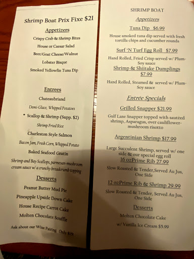 We have been going to Shrimp Boat for many years (both locations) and have always been very pleased with the taste and quality of the food. Its our "go-to-place" when family come to town and want seafood as they are never disappointed. The new three course meal deal won over many when family came to visit just a couple of weeks ago and my mom said the duck was the best she ever had (and she is not easy to impress!!!). The only reason we did not give it a 5 star rating is the cost is just a bit higher than we feel it should be and due to the portions, not the quality. The food tastes amazing and we have been pretty lucky with the service so no complaints!.